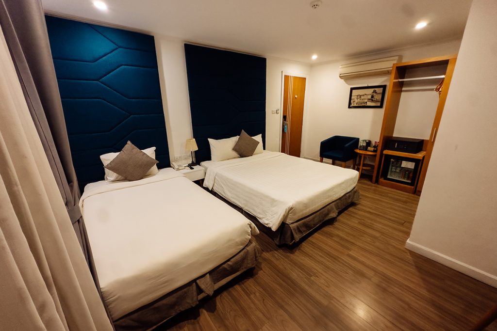 Very spacious room- great for families and groups of friends. Relax in our comfortable king size beds. Equipped with mini fridge, TV, desk, AC, en-suite bathroom, shampoo and shower gel, kettle with tea and coffee.